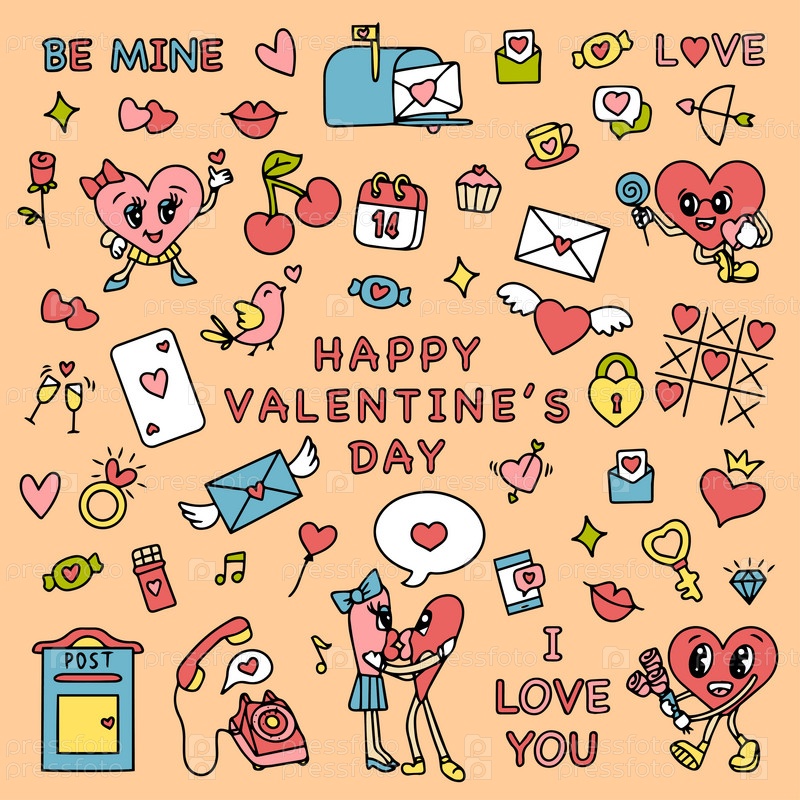 Модный заводной набор наклеек ко Дню святого Валентина. Ретро День святого Валентина. Эстетика 70-60-х годов. Винтажный вектор комиксов. Векторная иллюстрация