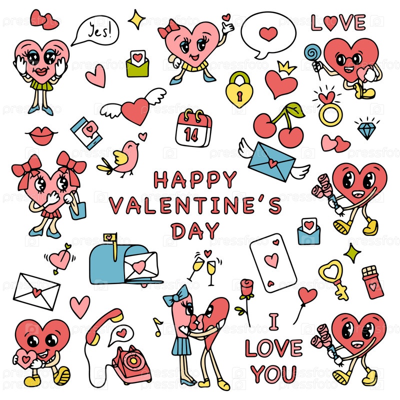 Модный заводной набор наклеек ко Дню святого Валентина. Ретро День святого Валентина. Эстетика 70-60-х годов. Винтажный вектор комиксов. Векторная иллюстрация