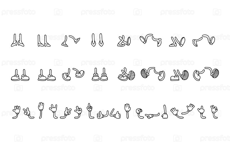 Винтажные мультяшные руки в перчатках и ноги в туфлях. Симпатичные части тела анимационных персонажей. Жесты рук комиксов и векторный набор прогулочных ног. Различные движения и положение ног