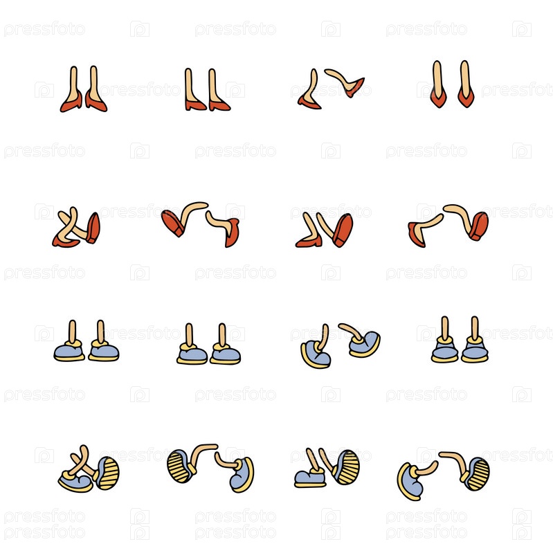 Ретро-мультяшные ножки. Винтажные комические ноги в туфлях. Различные движения и положения ног. Анимированные части тела талисмана. Векторная иллюстрация