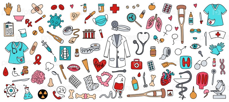 Ручные медицинские и медицинские рисунки. Здравоохранение, аптека, коллекция медицинских икон. Векторная иллюстрация