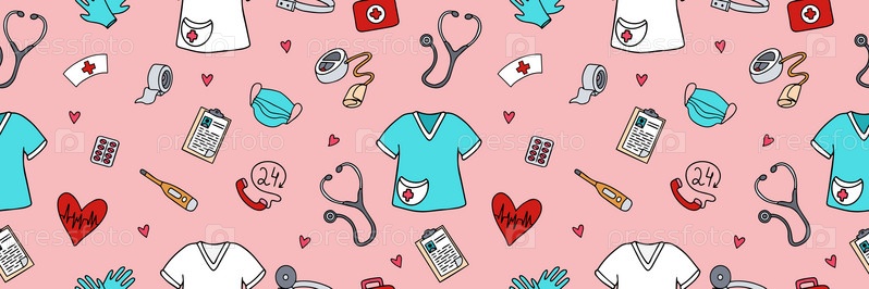 Бесшовный рисунок с лекарствами, диагностическими и лечебными предметами. Векторная ручная иллюстрация в стиле каракулей. Аптечка первой помощи. Векторная иллюстрация