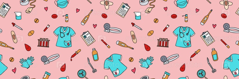 Бесшовный рисунок с лекарствами, диагностическими и лечебными предметами. Векторная ручная иллюстрация в стиле каракулей. Аптечка первой помощи. Векторная иллюстрация
