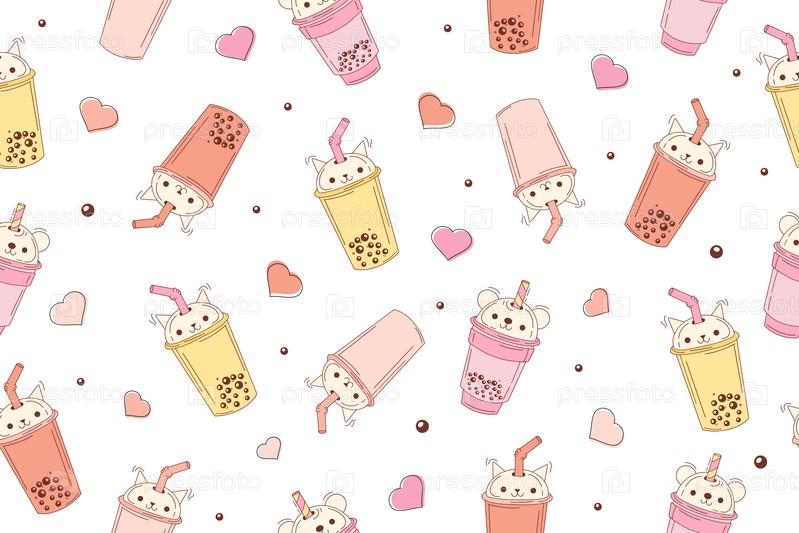 Пузырьковый чай с молоком смешной бесшовный узор. Нарисованные вручную каваи улыбались напиткам с жемчугом тапиоки. Симпатичная векторная иллюстрация мультфильма. Красочный фон с персонажами чая со льдом