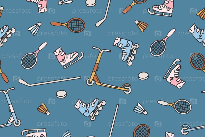 Бесшовный рисунок со спортивным инвентарем. Красочный спортивный инвентарь ручной работы. Узор на тему спорта, здорового образа жизни. Фон для использования в дизайне, упаковке, веб-сайте, ткани. Вектор