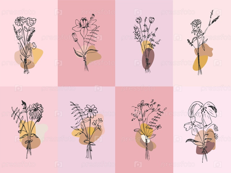 Набор с изображением букетов цветов, изолированных на светлом фоне. Вектор