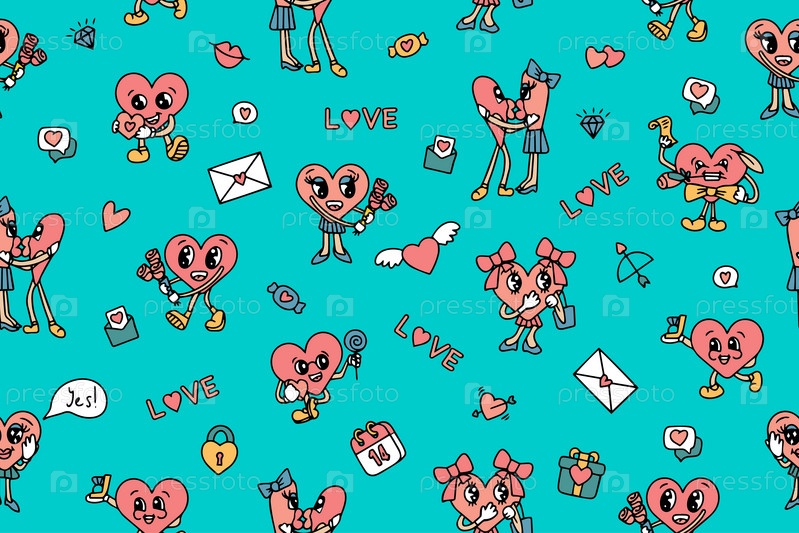 Бесшовный узор ко Дню святого Валентина с элементами заводного стиля. Векторный узор в стиле ретро 70-х, 80-х годов. Симпатичные сердечные персонажи. Векторная иллюстрация