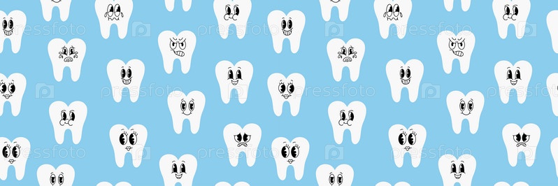 Бесшовный рисунок с милыми зубами. Белые зубы в стиле каваи. Стоматологический милый фон. Иллюстрация для кабинета детского стоматолога, детская стоматология. Вектор