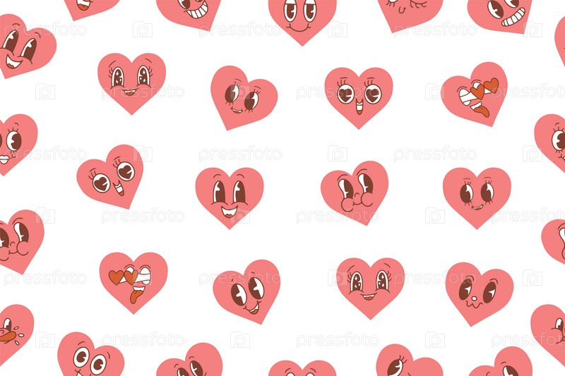 Векторный рисунок с милыми мультяшными розовыми сердечками. Бесшовный узор ко Дню святого Валентина. Модные ретро-мультяшные сердечные персонажи бесшовный фон. Заводной стиль, винтаж, эстетика 70-х 60-х