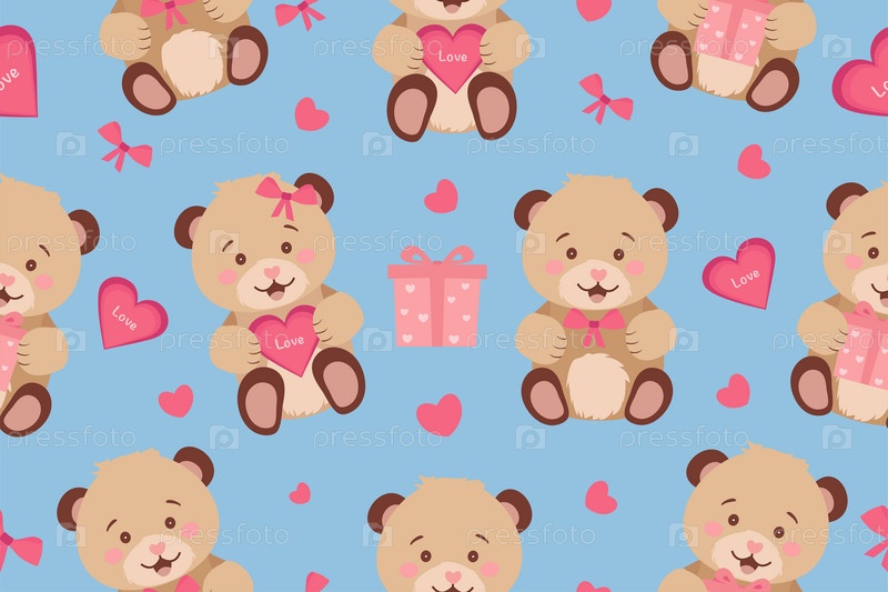 Бесшовный узор с милыми плюшевыми мишками. Оберточная бумага, интерьерные обои, печать, шаблон оформления. Векторная иллюстрация