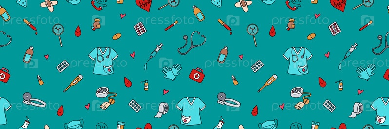 Бесшовный рисунок с лекарствами, диагностическими и лечебными предметами. Векторная ручная иллюстрация в стиле каракулей. Аптечка первой помощи. Оборудование для аптек и больниц.Векторная иллюстрация