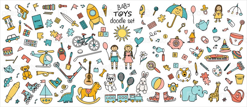 Красочный набор детских игрушек, спортивных и творческих товаров. Дудл. Векторная иллюстрация