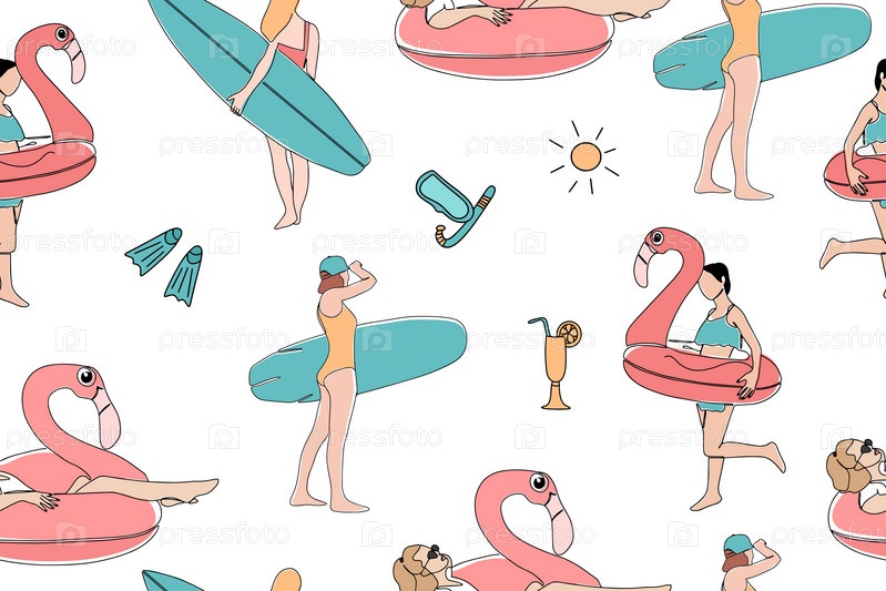 Бесшовный летний узор. Девушки с досками для серфинга и надувным кольцом в форме розового фламинго. Летняя вечеринка. Векторная иллюстрация