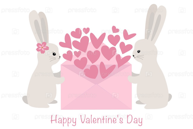 Симпатичные кролики держат конверт с сердечками. Концепция любви. Векторная иллюстрация изолирована на белом фоне