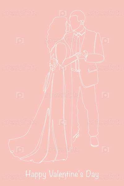 Открытка с Днем святого Валентина. Непрерывный рисунок пар, которые любят друг друга, держатся за руки. Векторная иллюстрация