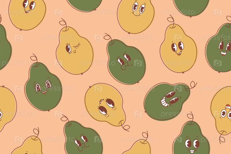 Бесшовный узор из груш в стиле каваи с глазами. Счастливый милый мультяшный набор смайликов груши. Векторная иллюстрация здоровой вегетарианской пищи