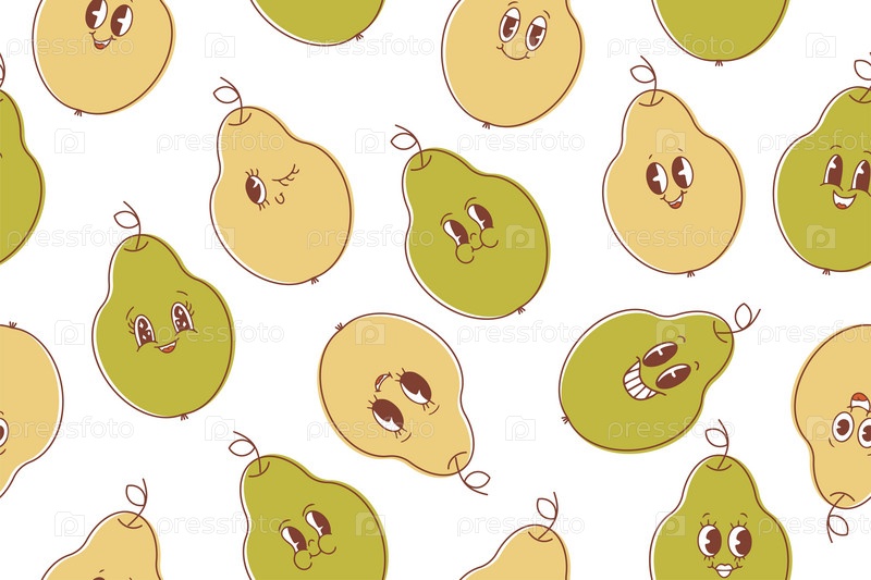 Бесшовный узор из груш в стиле каваи с глазами. Счастливый милый мультяшный набор смайликов груши. Векторная иллюстрация здоровой вегетарианской пищи