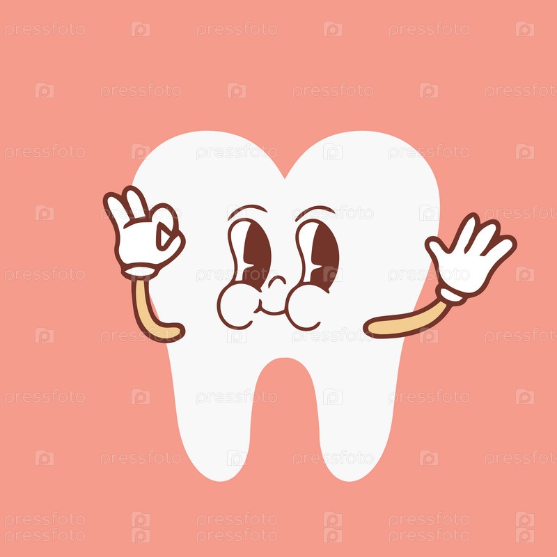 Заводной зубной персонаж мультфильма машет рукой. Забавный здоровый белый коренной зуб со счастливым лицом, ретро-мультяшный талисман зубов, наклейка на стоматологию и стоматологическую помощь векторной иллюстрации 70-х 80-х годов. Векторная иллюстрация