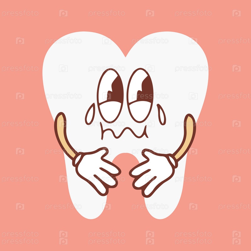 Забавный здоровый белый коренной зуб с грустным плачущим лицом, ретро-мультяшный талисман зубов, наклейка на стоматологию и стоматологическую помощь векторной иллюстрации 70-х 80-х годов. Векторная иллюстрация