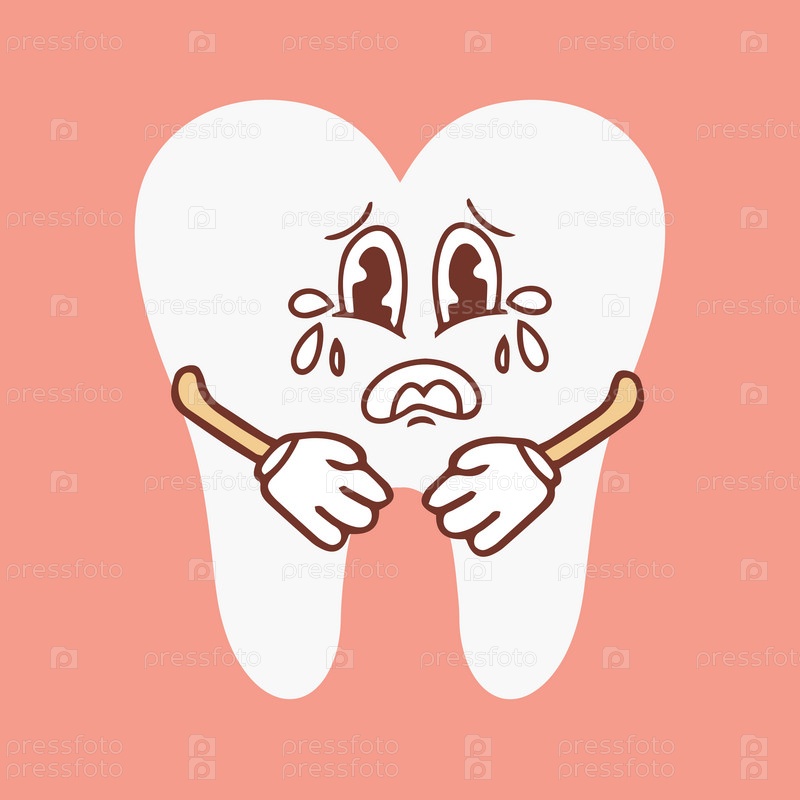 Забавный здоровый белый коренной зуб с грустным плачущим лицом, ретро-мультяшный талисман зубов, наклейка на стоматологию и стоматологическую помощь векторной иллюстрации 70-х 80-х годов. Векторная иллюстрация
