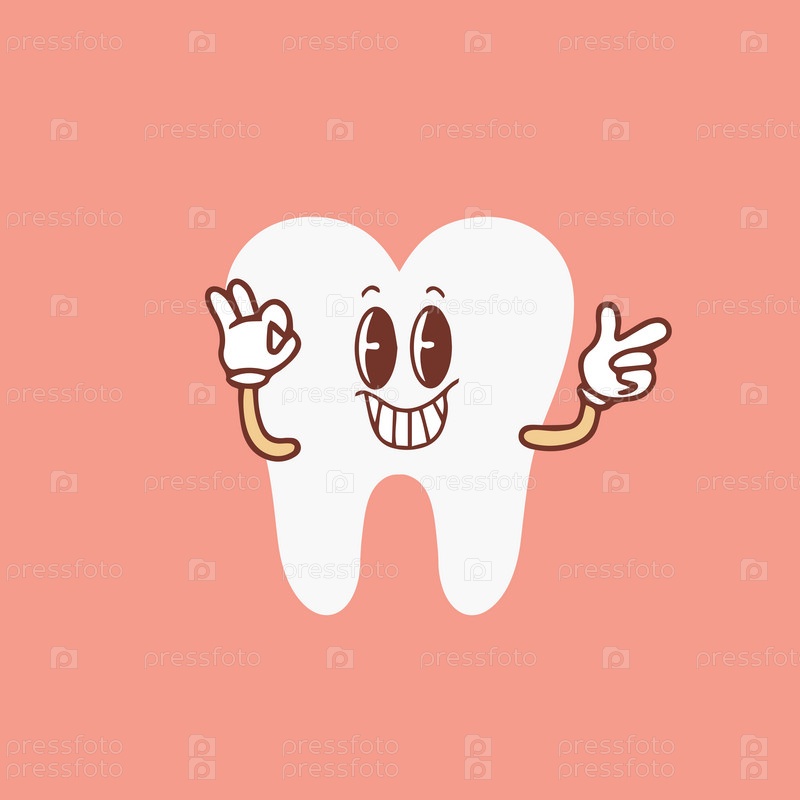 Заводной зубной персонаж мультфильма машет рукой. Забавный здоровый белый коренной зуб со счастливым лицом, ретро-мультяшный талисман зубов, наклейка на стоматологию и стоматологическую помощь векторной иллюстрации 70-х 80-х годов. Векторная иллюстрация