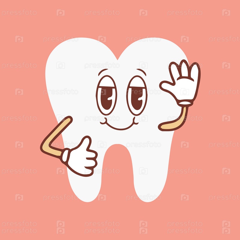 Заводной зубной персонаж мультфильма машет рукой. Забавный здоровый белый коренной зуб со счастливым лицом, ретро-мультяшный талисман зубов, наклейка на стоматологию и стоматологическую помощь векторной иллюстрации 70-х 80-х годов. Векторная иллюстрация