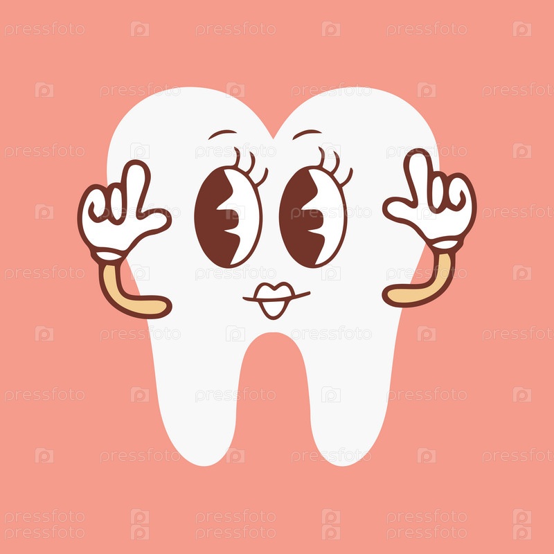 Заводной зубной персонаж мультфильма машет рукой. Забавный здоровый белый коренной зуб со счастливым лицом, ретро-мультяшный талисман зубов, наклейка на стоматологию и стоматологическую помощь векторной иллюстрации 70-х 80-х годов. Векторная иллюстрация