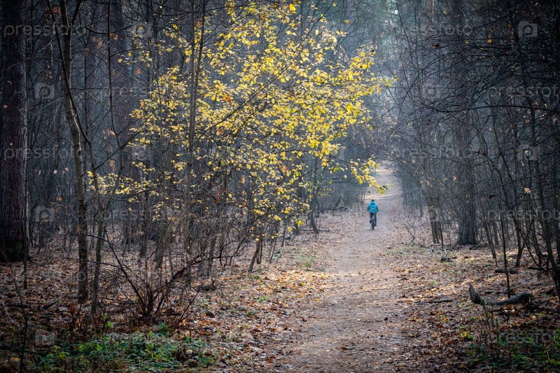 Лесная тропинка с велосипедистом в позднем осеннем лесу