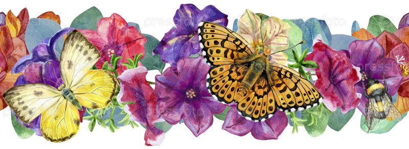 Композиция из милых цветов петунии. Акварельная иллюстрация