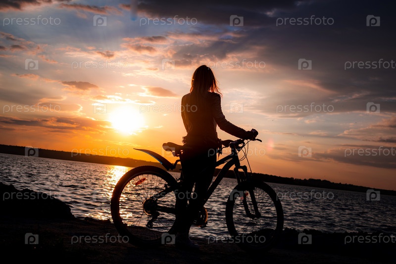 Силуэт девушки с велосипедом на берегу озера на закате