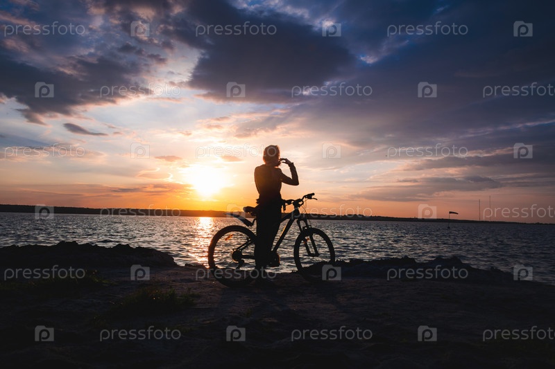 Силуэт девушки с велосипедом на берегу озера на закате