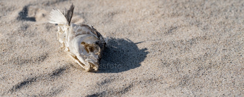 Скелет сушеной рыбы лежит на песке