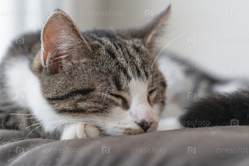 Милый молодой кот спит на солнце на подоконнике