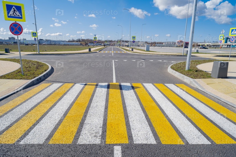 Открытое пространство с дорожными знаками и дорожной разметкой, дорожными перекрестками, пешеходными переходами, солнечным днем, голубым небом, фоном городского пейзажа