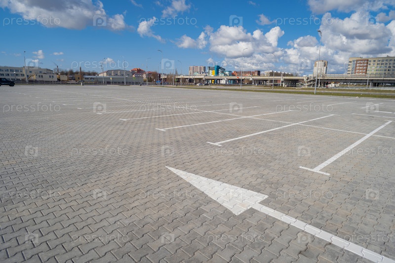 Открытое пространство с дорожными знаками и дорожной разметкой, дорожными перекрестками, пешеходными переходами, солнечным днем, голубым небом, фоном городского пейзажа