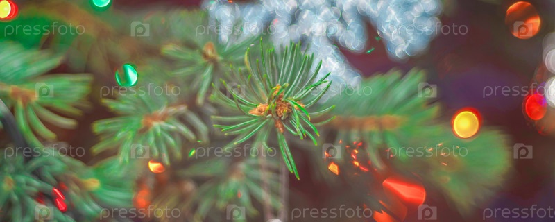 Яркая рождественская елка с украшениями и яркими огнями, мягкий фокус, размытый фон