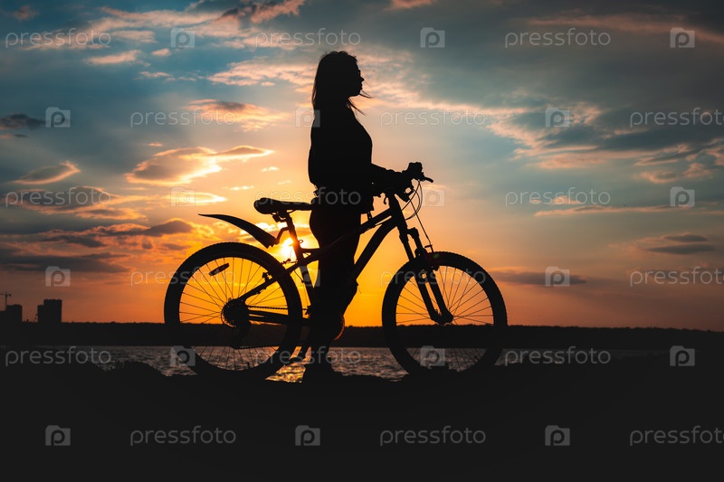Силуэт девушки с велосипедом на берегу озера на закате
