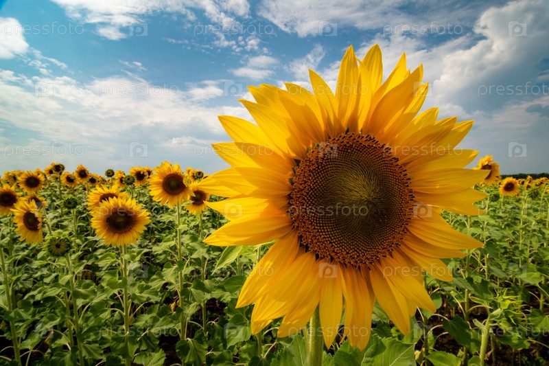 Подсолнух в поле под облачным небом