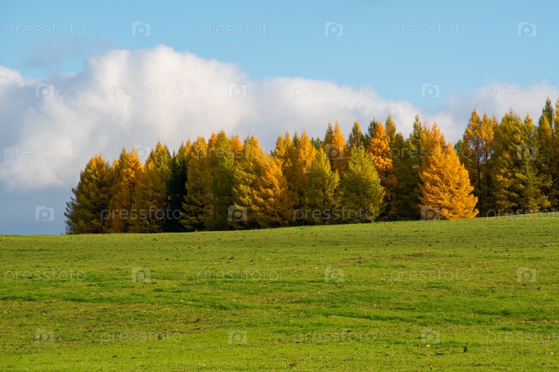 Осенние золотые лиственницы под голубым небом и облаками