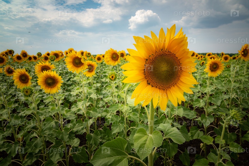 Подсолнух в поле под облачным небом