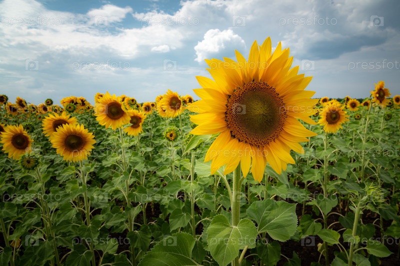 Подсолнух в поле под облачным небом