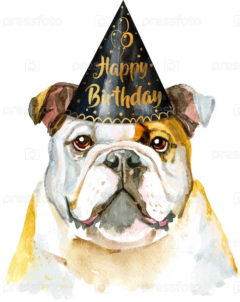 Милая собака в праздничной шляпе. Графика на футболках с собаками. Акварельная иллюстрация собаки