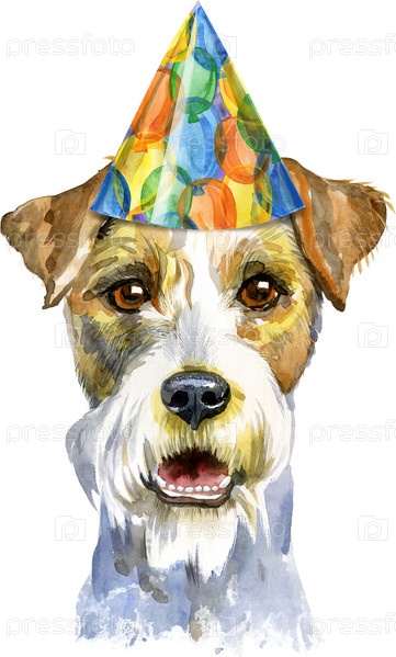 Милая собака в праздничной шляпе. Графика на футболках с собаками. Акварельная иллюстрация эрдельтерьера