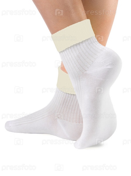 Вид сбоку на красивую женскую ногу, одетую в новые красивые и мягкие белые носки из натуральной хлопчатобумажной ткани
