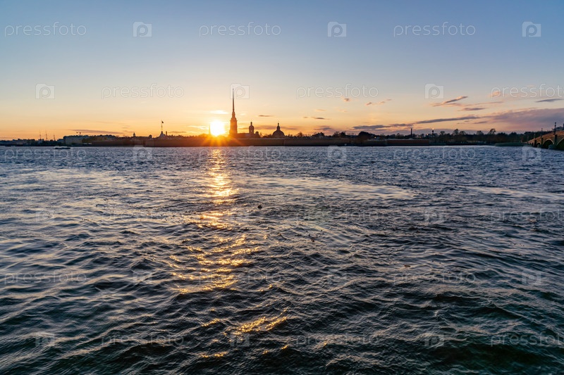 Вид с дворцовой набережной Петропавловской крепости на закате