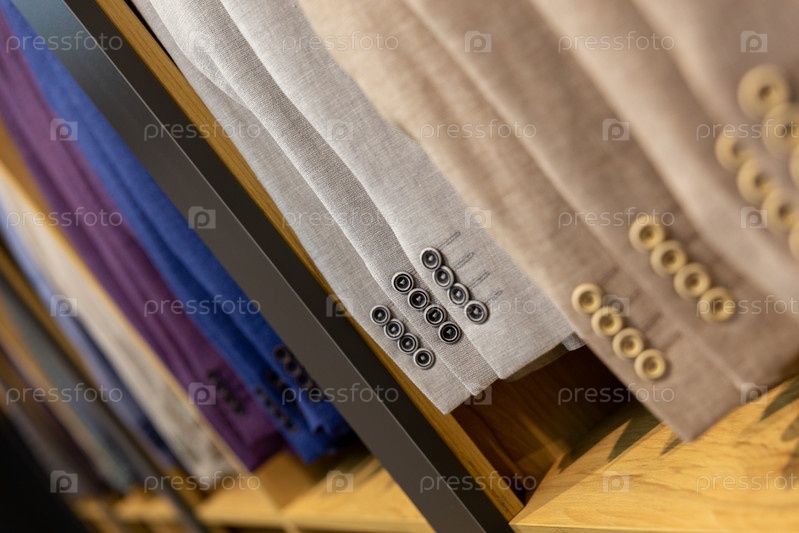 На вешалке висят ряды мужских костюмов и курток. Элегантные мужские пиджаки висят в ряд с крупным планом рукавов и пуговиц