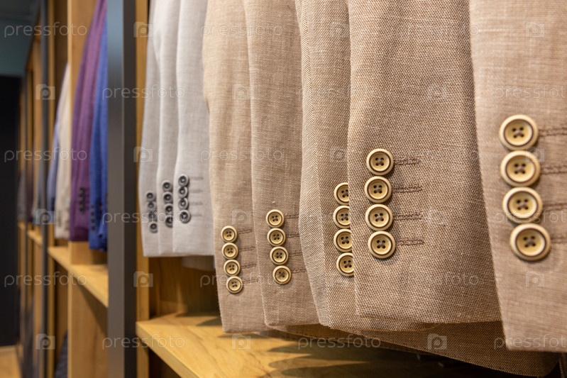 На вешалке висят ряды мужских костюмов и курток