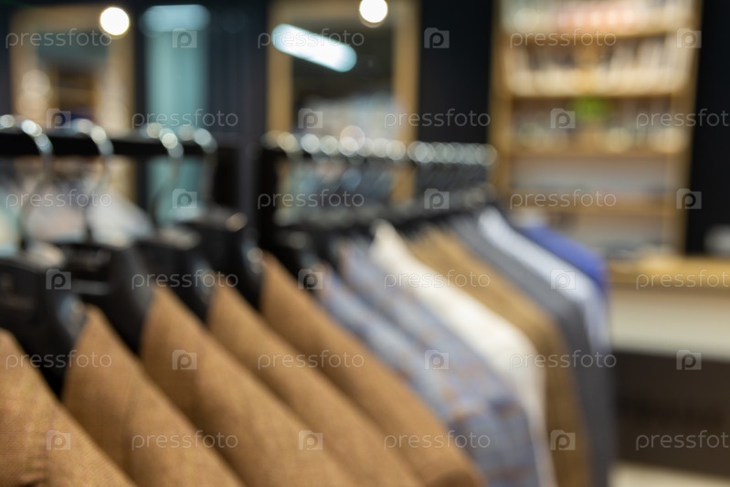 Размытый фон с мужскими костюмами, куртками, висящими на вешалке для демонстрации. Элегантные мужские пиджаки висят в ряд