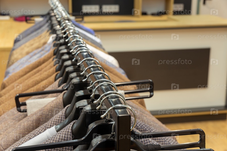 На вешалке висят ряды мужских костюмов и курток. Элегантные мужские пиджаки висят в ряд с крупным планом рукавов и пуговиц
