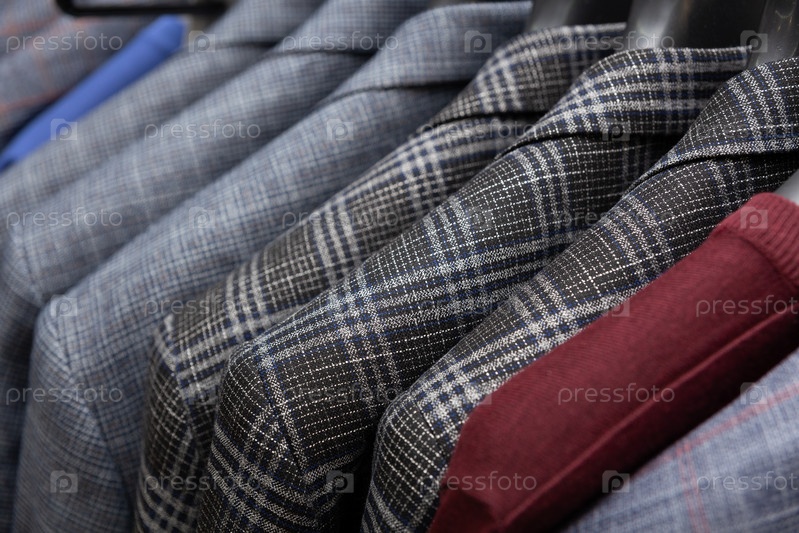 На вешалке висят ряды мужских костюмов и курток
